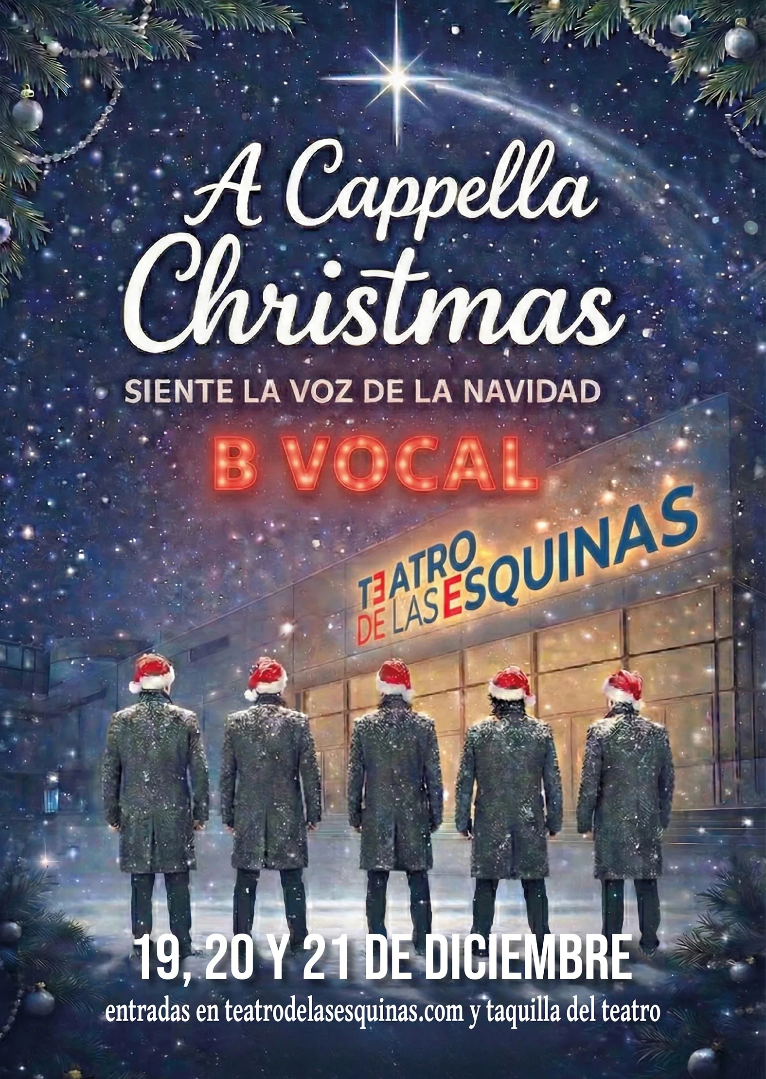 En este concierto vas a ver y escuchar una cuidada selección de villancicos y otros temas de gospel, música pop y bandas sonoras que están en el imaginario colectivo interpretadas de forma magistral sin instrumento alguno y con el inconfundible estilo musicómico de la B Vocal.