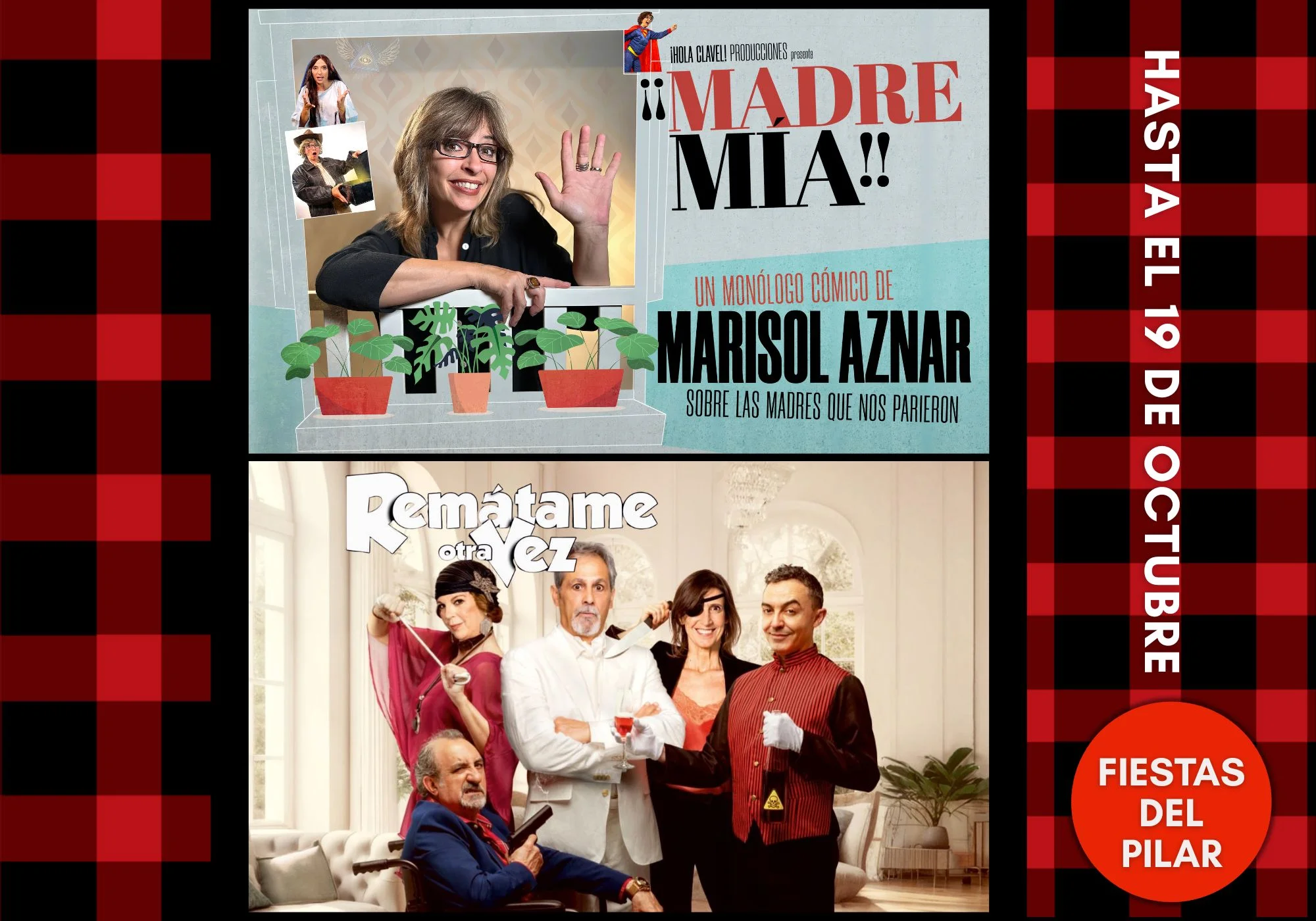 Y completa la cartelera ¡Remátame otra vez!, una comedia thriller que está arrasando esta temporada, con un reparto de lujo: Jesús Cabrero, Ángel Ruiz, Belinda Washington, Juanjo Cucalón y Roser Pujol.